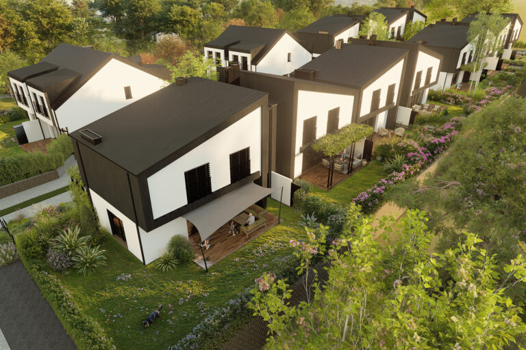 Scandinavia to kameralne osiedle 28 domów w zabudowie bliźniaczej i szeregowej, zaprojektowane w tarasowym układzie, wpisanym w naturalny spadek terenu, jako spójna, harmonijna całość, inspirowana estetyką północnej Europy. Proste, geometryczne bryły, jasne elewacje w odcieniu kości słoniowej, grafitowe dachy, naturalne drewno oraz duże przeszklenia tworzą ponadczasową kompozycję, w której kluczową rolę odgrywają światło i proporcje.