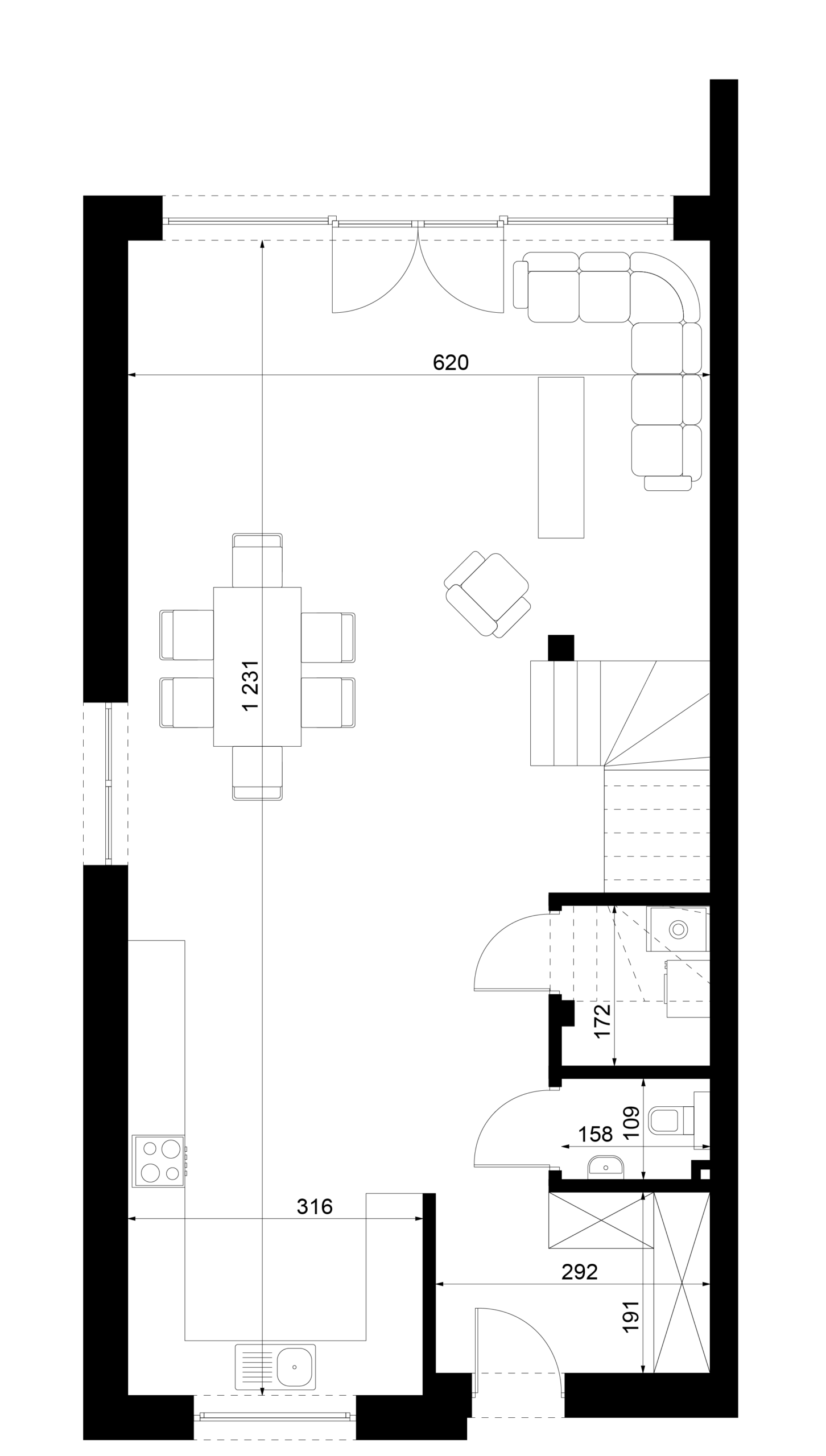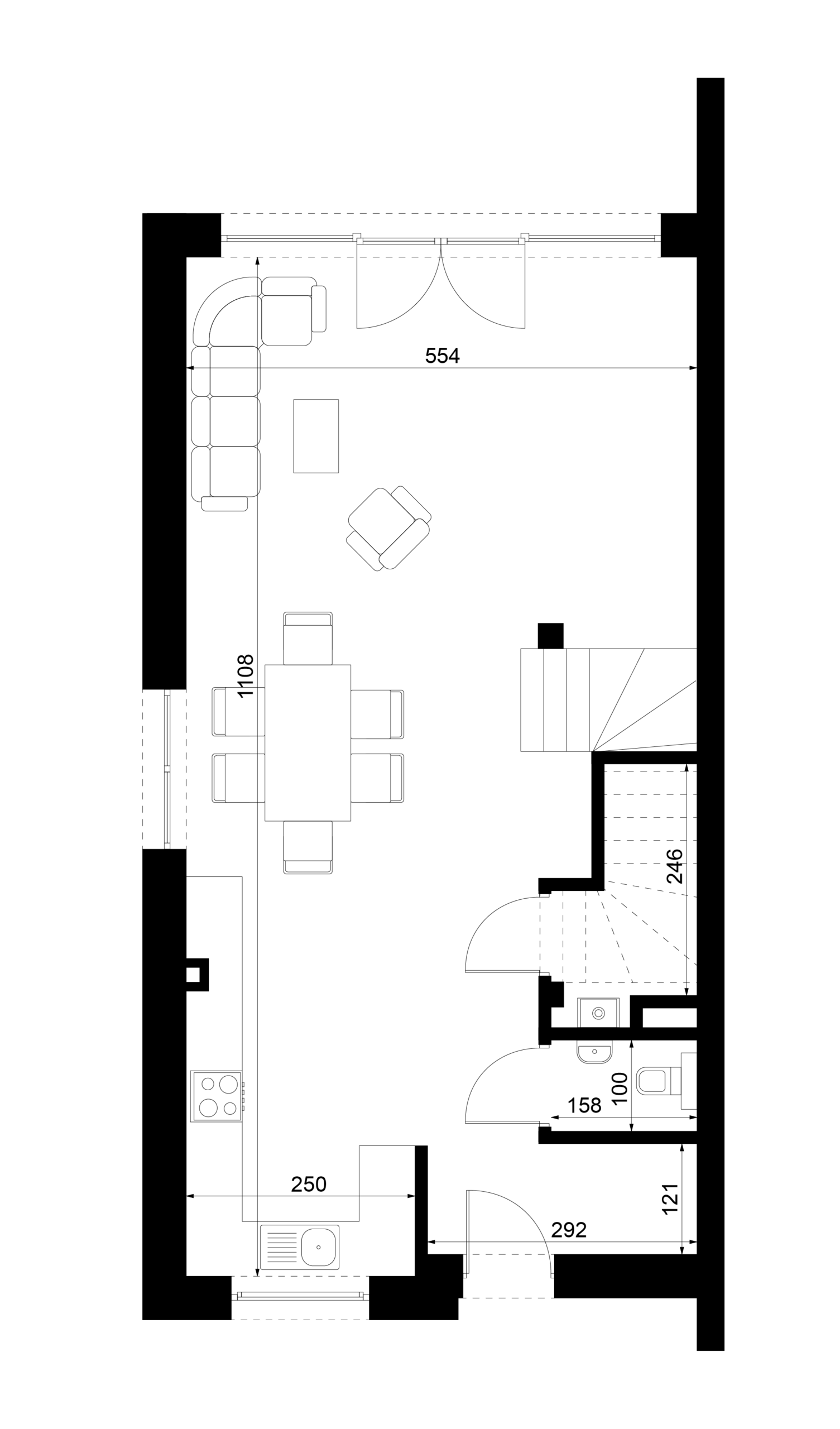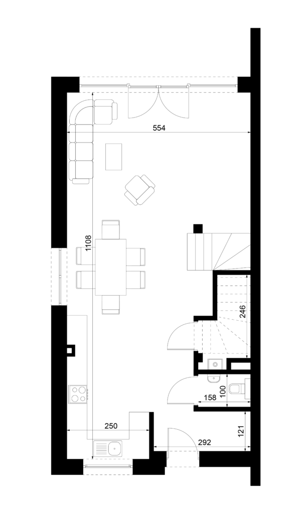 Kluczową ideą projektu jest możliwość kształtowania wnętrza „szytego na miarę” – zarówno układ parteru, jak i piętra może być dostosowany do indywidualnych oczekiwań mieszkańców. Otwarta strefa dzienna, ściany działowe na piętrze czy funkcje pomieszczeń mogą być modyfikowane w szerokim zakresie, przy zachowaniu stałych, zewnętrznych ram architektonicznych budynku.Rozwiń ∨