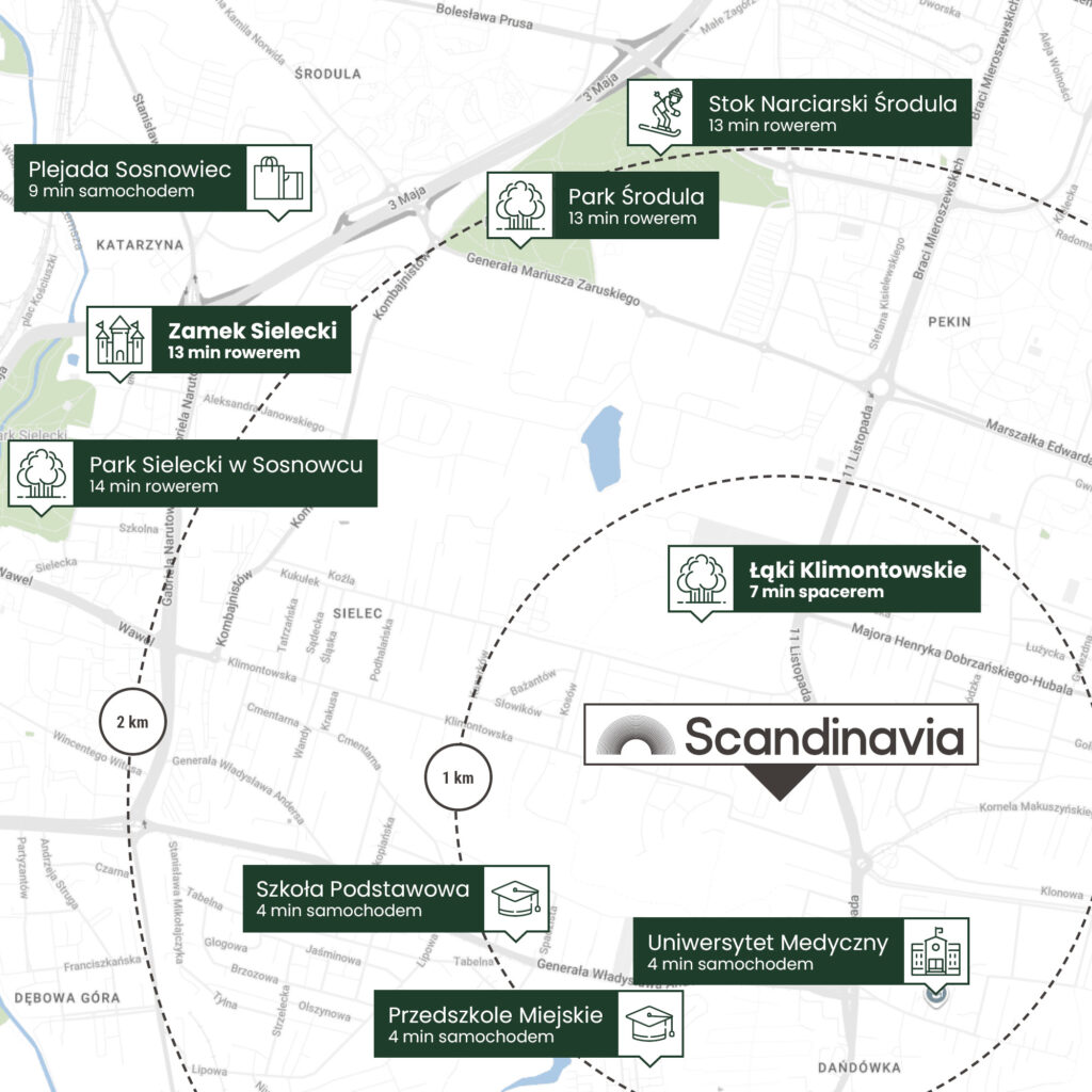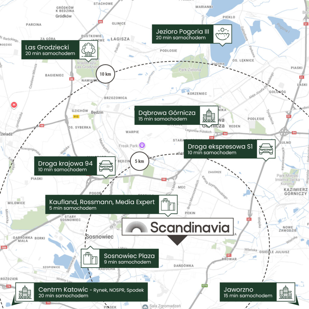 Scandinavia znajduje się w prestiżowej, zielonej dzielnicy Kukułek w Sosnowcu, oferując szybki i wygodny dojazd do najważniejszych punktów Górnośląsko-Zagłębiowskiej Metropolii. Centrum Sosnowca oddalone jest o ok. 10 minut, a Katowice o ok. 15 minut samochodem, co zapewnia łatwy dostęp do zaplecza biznesowego, edukacyjnego i kulturalnego regionu.