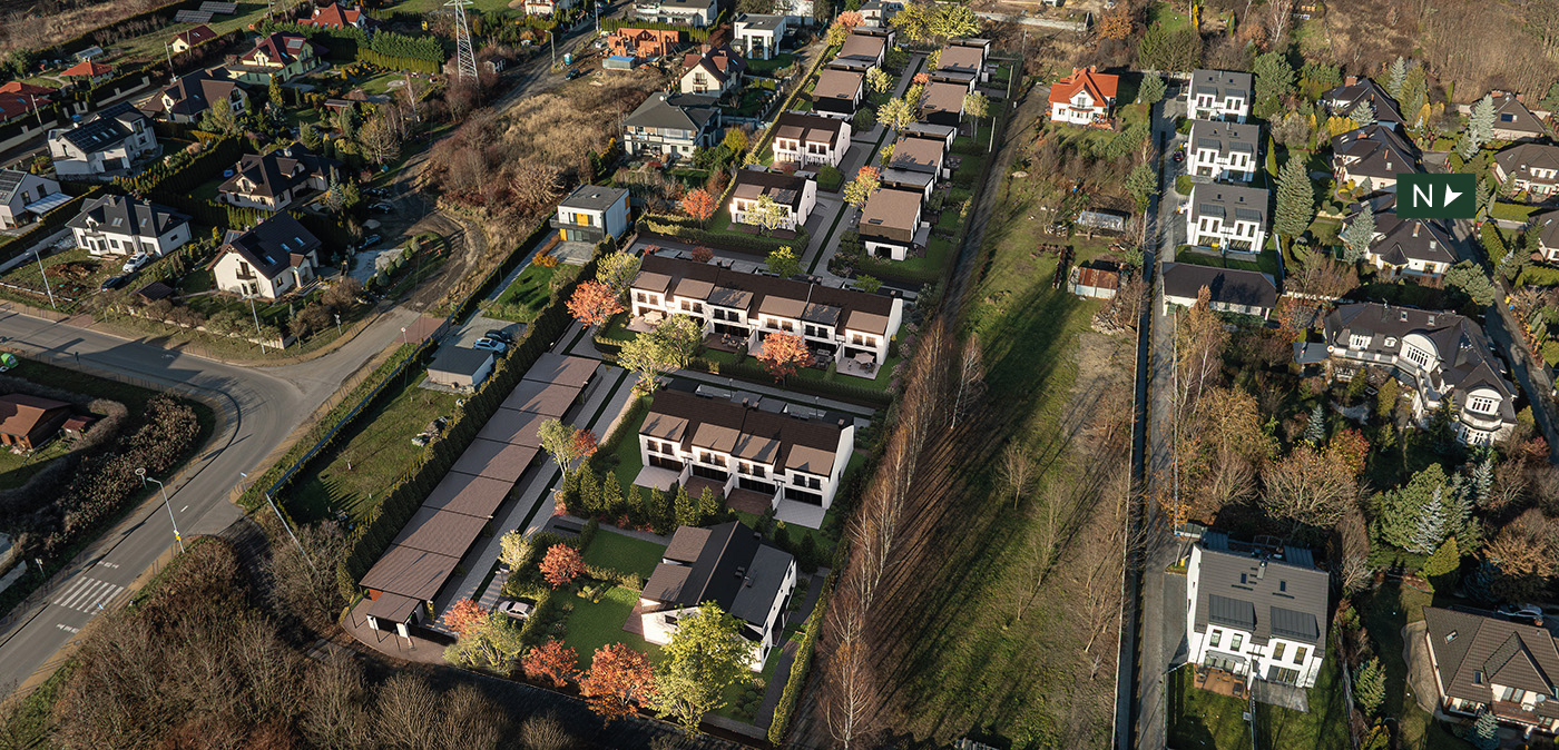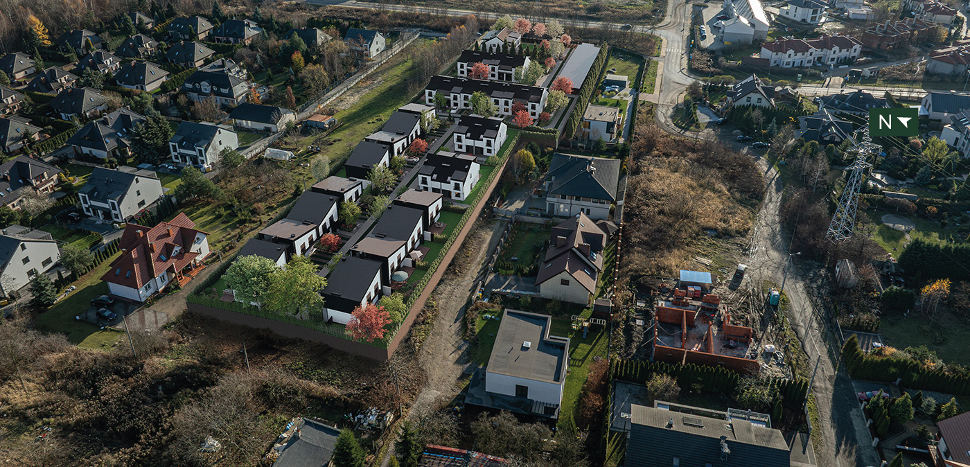 Osiedle jest w pełni ogrodzone i zamknięte, z kontrolowanym wjazdem, starannie zaprojektowaną zielenią w nordyckim stylu oraz subtelnym oświetleniem i detalami małej architektury. Prywatne ogrody z tarasami stanowią naturalne przedłużenie strefy dziennej. Przy wjeździe na osiedle znajdują się garaże, a przy domach istnieje dodatkowo możliwość postawienia wiat garażowych – każdy z tych elementów nawiązuje do skandynawskiego designu osiedla. Zwiń ∧
